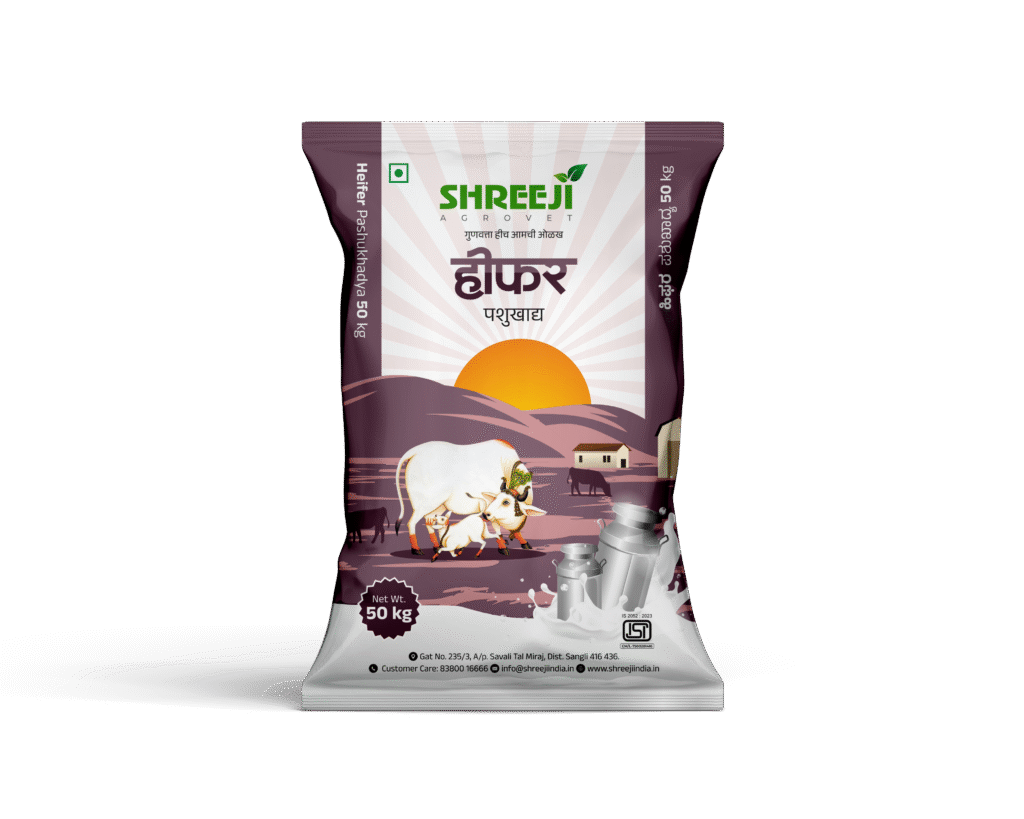 Shreeji Heifer Feed is a scientifically balanced and complete feed designed for growing heifers to ensure proper weight gain, reproductive organ development, and readiness for first conception. It helps maintain ideal body structure and supports overall health.